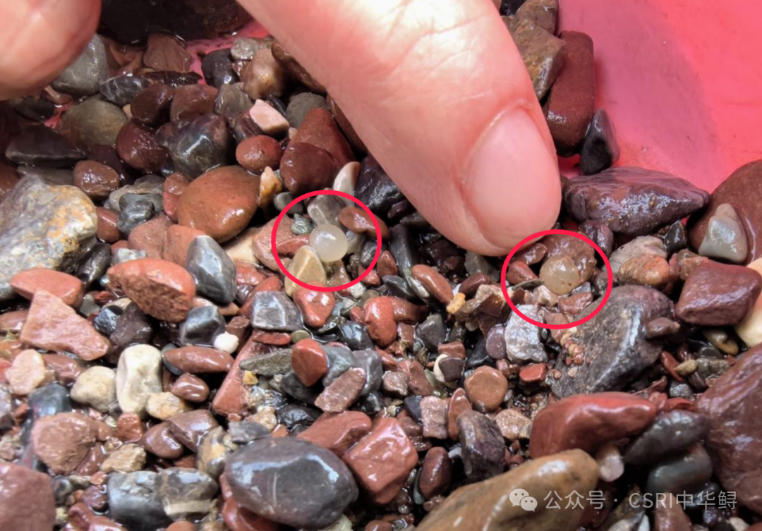 The picture shows cracked belly fish eggs found in sandy and gravel substrates